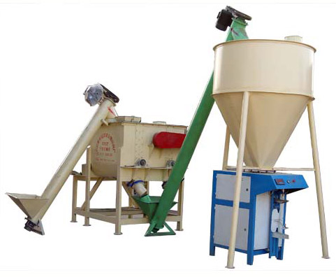 主要配置:大傾角螺旋上料機(jī)(分地上式和地下式,定購時請說明),平臺支架,無重力混合機(jī)(配飛刀),成品螺旋提升機(jī),儲料倉,全自動計量包裝,除塵器(選配),電器控制柜等組成。