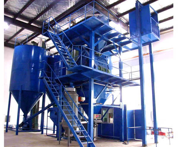 主要配置:原料倉,自動計(jì)量配料及稱重裝置,斗式提升機(jī),待混倉,高效混合機(jī),喂料機(jī),成品倉,自動稱量包裝機(jī),脈沖除塵器,支架爬梯平臺,電器控制柜等組成。